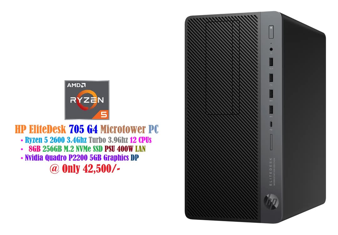HP EliteDesk 705 G4 Gaming Microtower Ryzen 5 2600 3.4Ghz 12 CPUs 8GB 256GB NVMe SSD PSU 400W Nvidia Quadro P2200 5GB Graphics