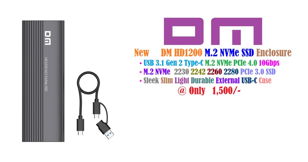 New DM HD1200 M.2 NVMe SSD Enclosure at 1,500/-