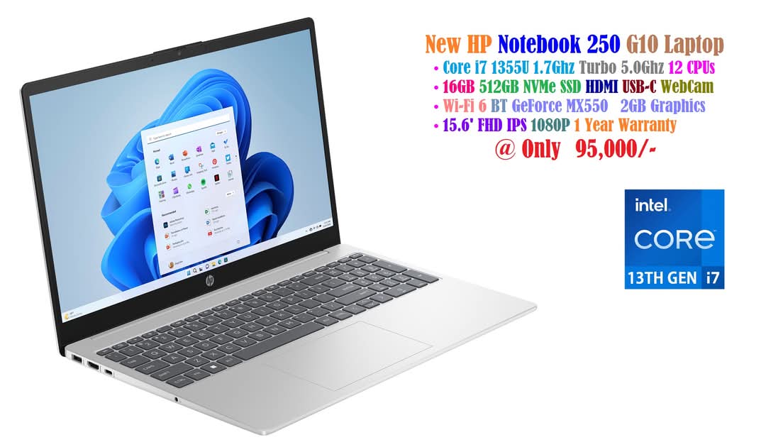 New HP Notebook 250 G10 Laptop PC Core i7 1355U 1.7Ghz 12 CPUs 16GB 512GB NVMe SSD 15.6′ FHD Nvidia Geforce MX550 2GB Graphics