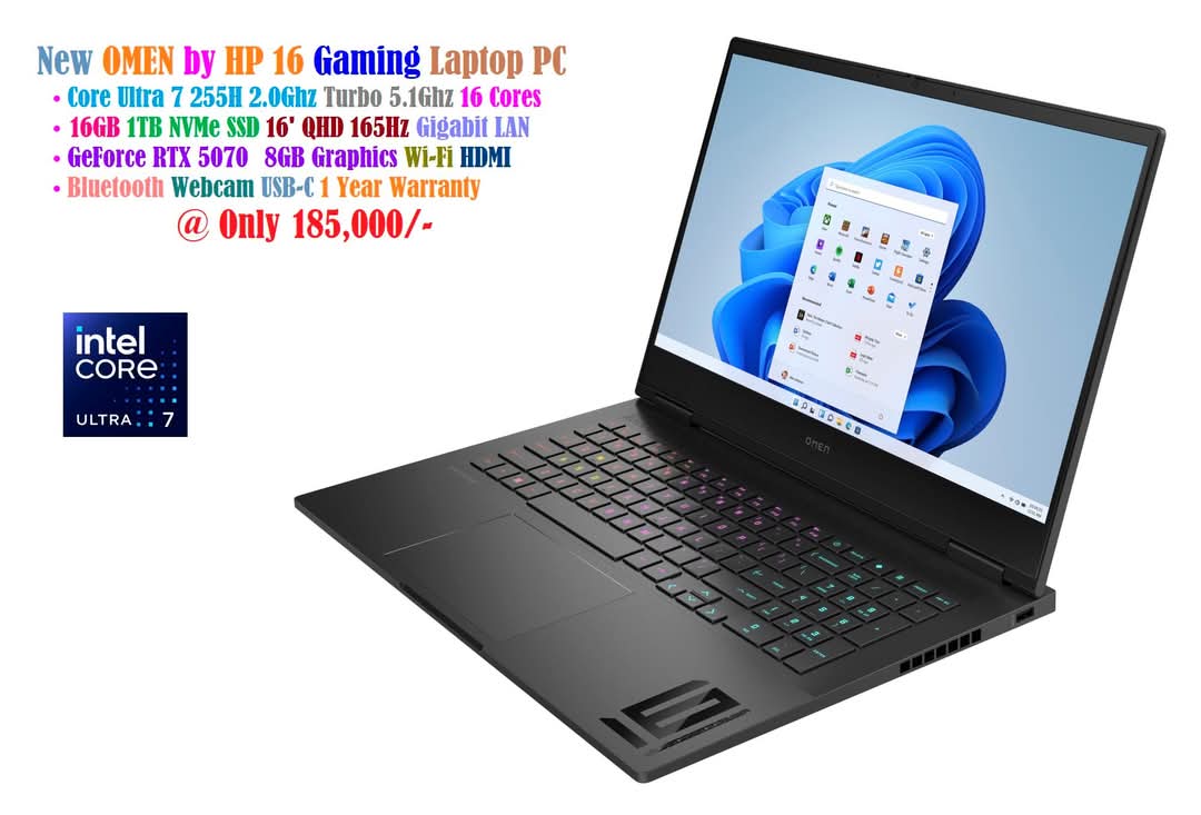 New HP OMEN 16 Gaming Laptop Core Ultra 7 255H 2.0Ghz 16 Cores 16GB 1TB NVMe SSD 16.1′ 165Hz QHD GeForce RTX 5070 8GB Graphics