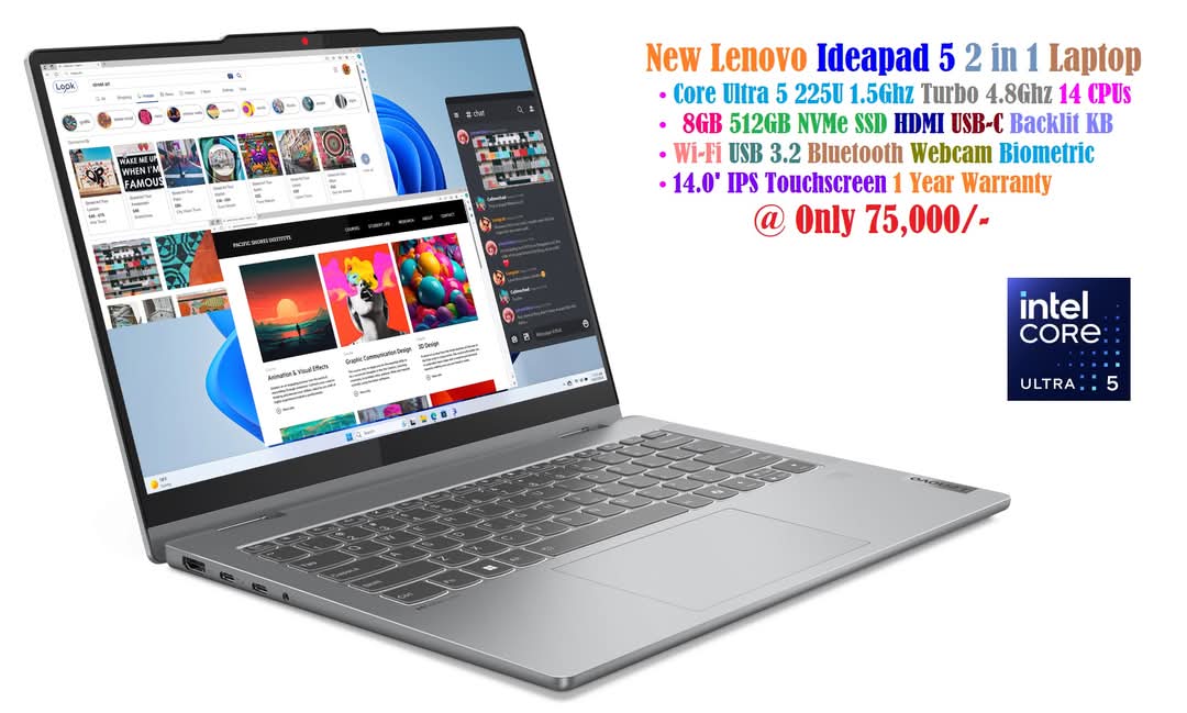 New Lenovo Ideapad 5 2 in 1 Laptop Core Ultra 5 225U 1.5Ghz 14 CPUs 16GB 512GB NVMe SSD 14.0′ IPS FHD Touchscreen Intel Arc Graphics